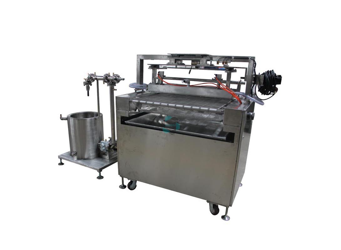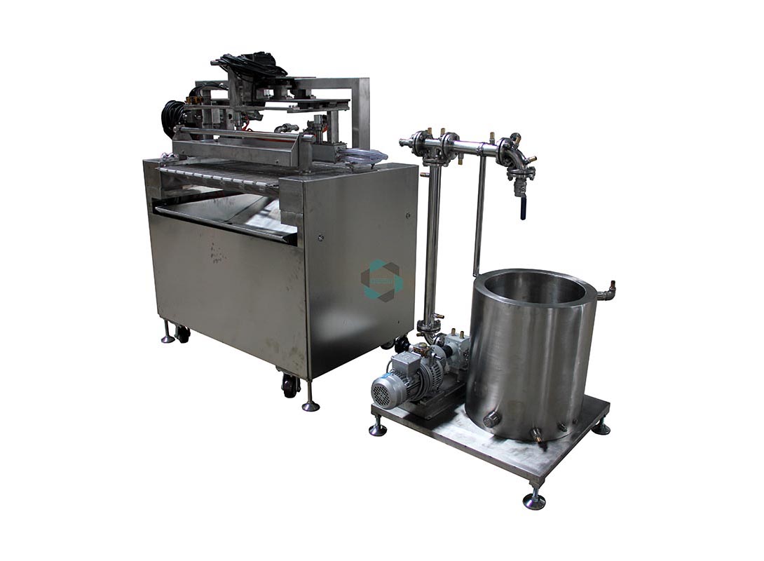 巧克力饰花机用于在从巧克力涂衣机出来并准备进入冷却隧道的巧克力产品表面制作各种图案。